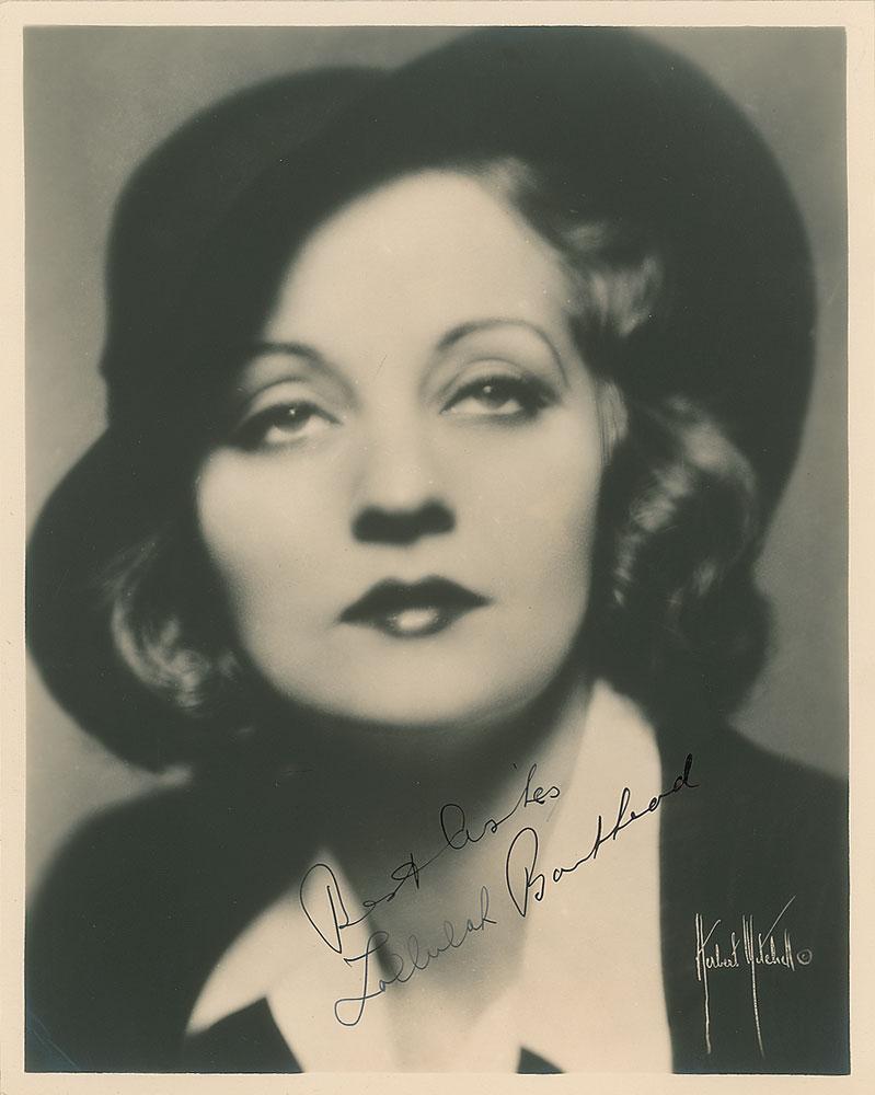 Desirable vintage matte-finish 8 x 10 soft-focus portrait of Tallulah Bankhead by noted Broadway photographer Herbert Mitchell, signed in fountain pen, "Best wishes, Tallulah Bankhead." In very fine condition.