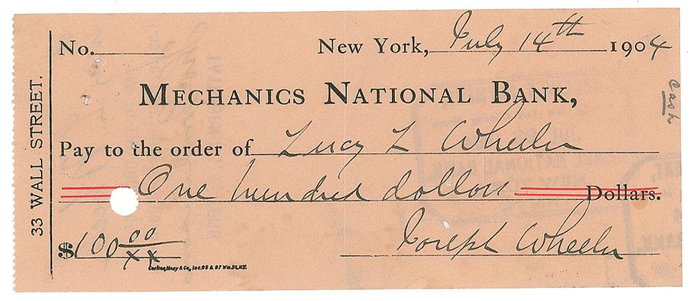 Confederate major general (1836-1906), known as 'Fightin' Joe,' who led his troops in vigorous opposition to Sherman during the Atlanta campaign. Mechanics National Bank check, 6.25 x 2.5, filled out and signed by Wheeler, "Joseph Wheeler," payable to Lucy L. Wheeler for $100, July 14, 1904. In fine condition.