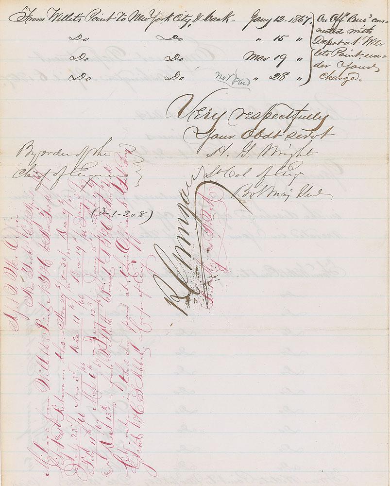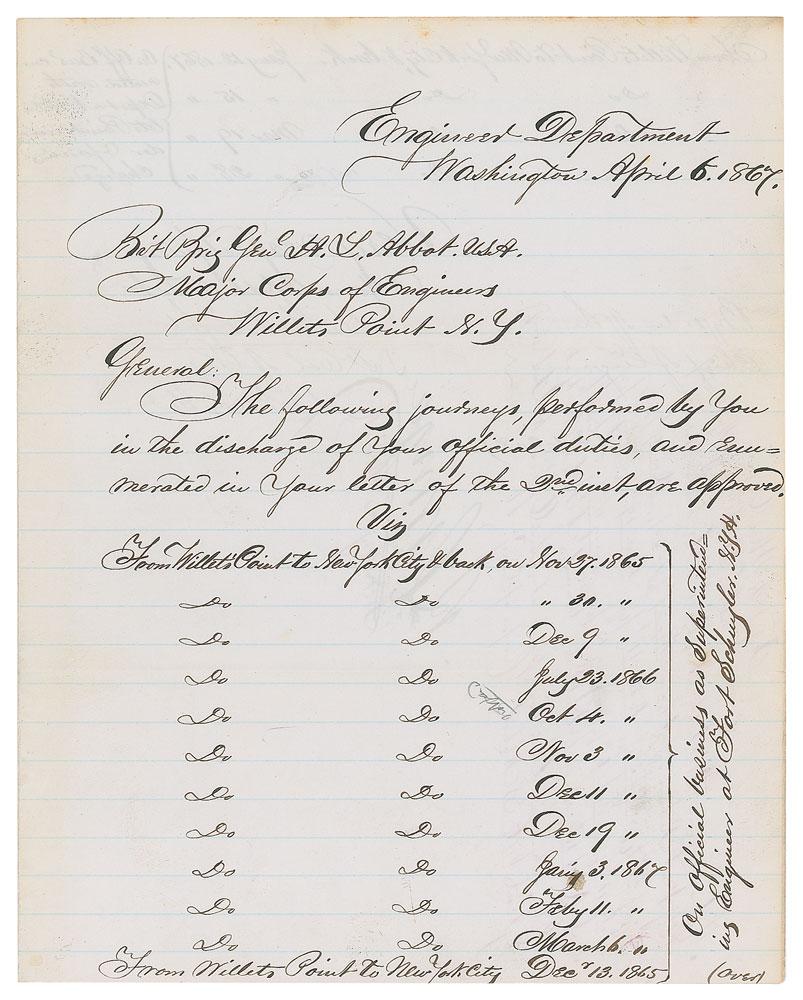Engineer and general (1820-1899) who served in the Union Army during the Civil War, responsible for building the fortifications around Washington and commanding troops in the Overland Campaign. In his postwar career, he was involved in a number of major engineering projects, including the construction of the Brooklyn Bridge and completion of the Washington Monument. LS signed “H. G. Wright, Lt. Col. of Engrs., Bvt. Maj. Genl.,” one page both sides, 7.75 x 9.75, April 6, 1867. Letter to Bvt. Brig. Gen'l H. L. Abbott, listing the dates of "journeys, performed by you in the discharge of your official duties." In fine condition.