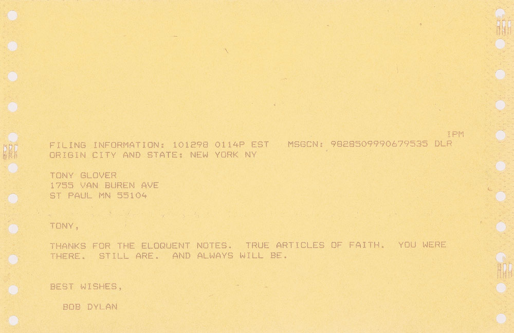 Western Union telegram sent by Bob Dylan to Tony Glover, one page, 8.5 x 5.5, October 12, 1998, full: "Tony, Thanks for the eloquent notes. True articles of faith. You were there. Still are. And always will be. Best wishes, Bob Dylan." Includes a carbon copy duplicate and the original envelope. In fine condition. Great content showing the importance of Glover in Dylan's life—an ever-reliable friend and colleague, Glover wrote the liner notes for The Bootleg Series Vol. 4: Bob Dylan Live 1966, The 'Royal Albert Hall' Concert, released on October 13, 1998. Tony was awarded the prestigious Deems Taylor Award for the liner notes. This award is like the Pulitzer Prize for Music Writing.