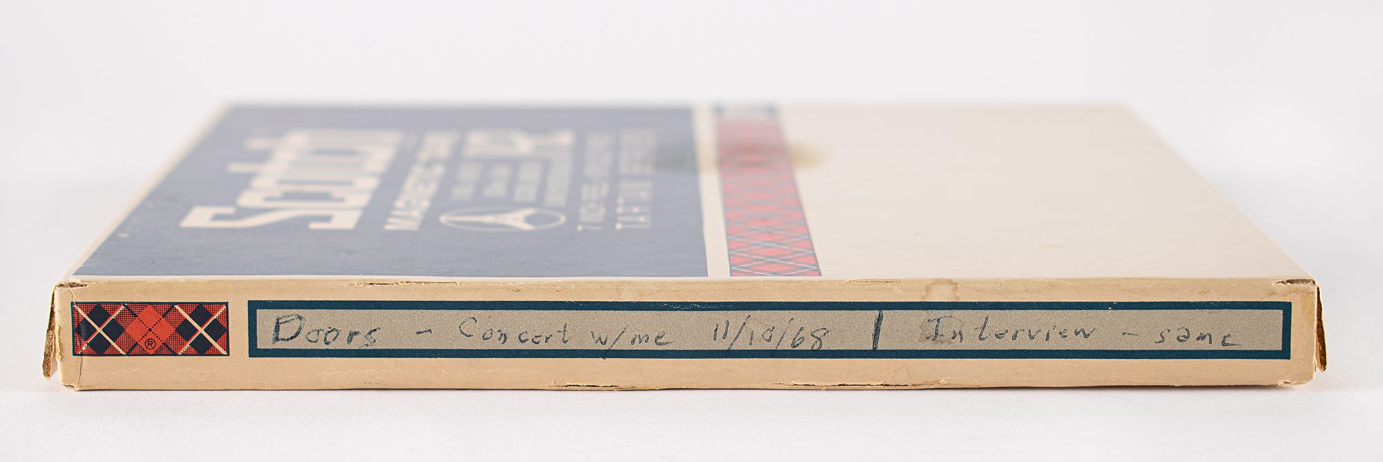 Tony Glover's archive of materials related to his interview/concert with The Doors at the Minneapolis Auditorium on November 10, 1968. Includes: a 1/4-inch reel-to-reel tape of the concert and interview, annotated on the box, "Doors - concert w/ me 11/10.68 / Interview - same," with Glover's handwritten track list inside: "Side One: 1. Soul Kitchen, 2. Break On Thru, 3. When the Music's Over, 4. Back Door Man, 5. Little Red Rooster, 6. Wild Child & Money, 7. Love Me Two Times, 8. Light My Fire"; an audio cassette tape recording of the interview; and two original vintage glossy 10 x 8 photos of the concert taken by Minneapolis rock photographer Mike Barich, both showing Glover playing alongside Jim Morrison. In overall very good to fine condition.