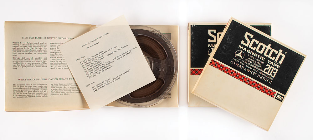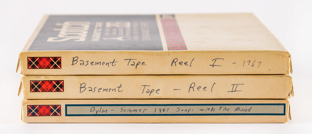 Tony Glover's set of three 1/4-inch reel-to-reel audio tapes of the legendary 'Basement Tapes' featuring Bob Dylan and The Band, marked on the spines: "Basement Tape, Reel I - 1967," "Basement Tape - Reel II," and "Dylan - Summer 1967 Songs with The Band." The first two are on Scotch 203 tape, and marked with track lists on the backs: "Million Dollar Bash, Apple Sucker Tree, Talkin' (Clothsline) Blues, Yea Heavy & A Bottle of Bread, I'm Not There, Odds & Ends, Get Your Rocks Off, Down in the Flood, Lo & Behold, Tiny Montgomery" and "This Wheel's On Fire, Nothing Was Delivered, Open the Door Homer, Quinn the Eskimo, You Ain't Goin Nowhere, Too Much of Nothin', Tears of Rage, Please Mrs. Henry, I Shall Be Released." The third reel, on Scotch 141 tape, has a typed track list of 13 songs inside, all of which appear on the other two tapes. In overall very good to fine condition.