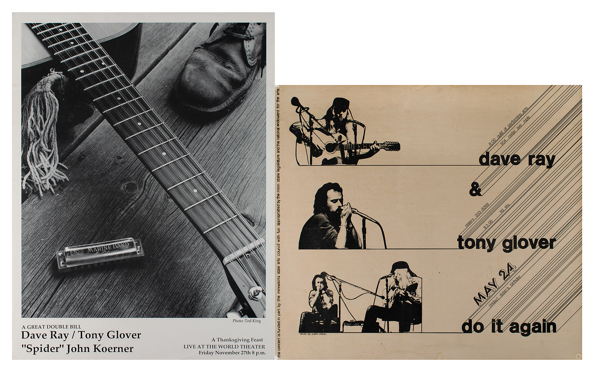 Collection of 38 music posters from the personal archives of Tony Glover, which includes a grouping of 29 color 21.75 x 30 promotional posters for Koerner, Ray & Glover’s debut 1963 album Blues, Rags and Hollers, which mentions a meet-and-greet at “The Coffee Break, Oak & Washington Ave., (Next to Campus Theater)”; one poster features creasing and three edge tears, three others bear folds to the lower right corner, with the balance in fine condition.