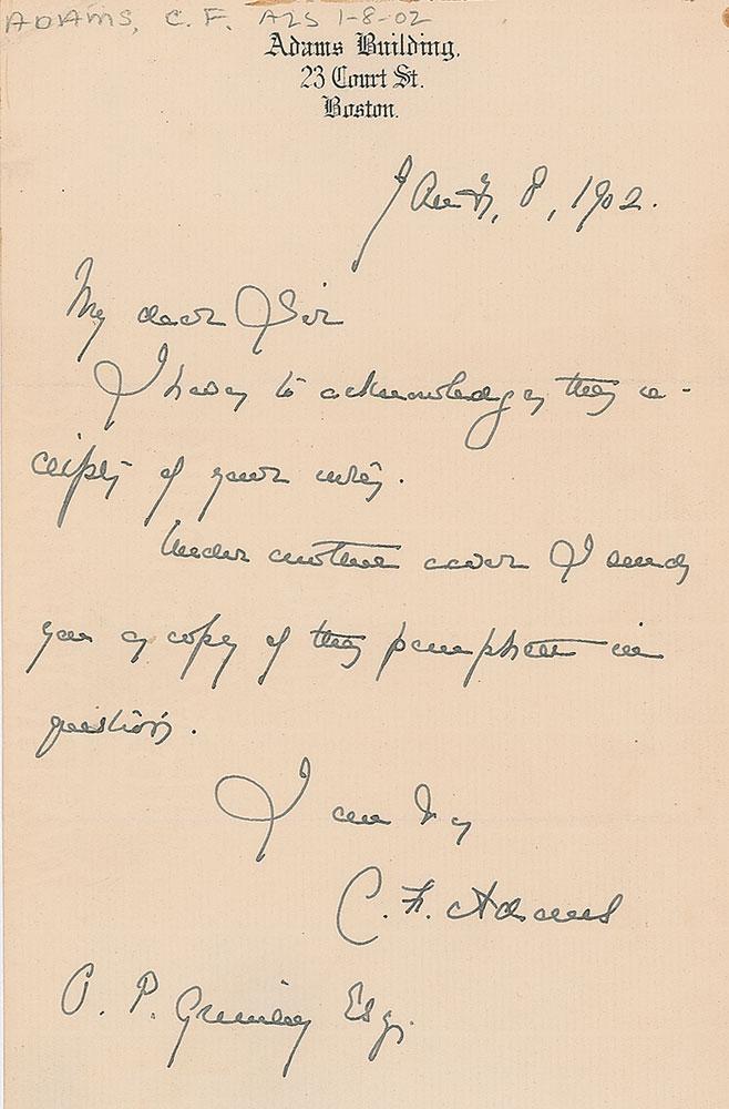 Grandson of John Quincy Adams (1866-1954) who served as the United States Secretary of the Navy under President Herbert Hoover. ALS signed “C. F. Adams,” one page, 5.25 x 8, Adams Building letterhead, January 8, 1902. In full: "I have to acknowledge the receipt of your letter. Under another cover I send you a copy of the pamphlet in question." In fine condition.
