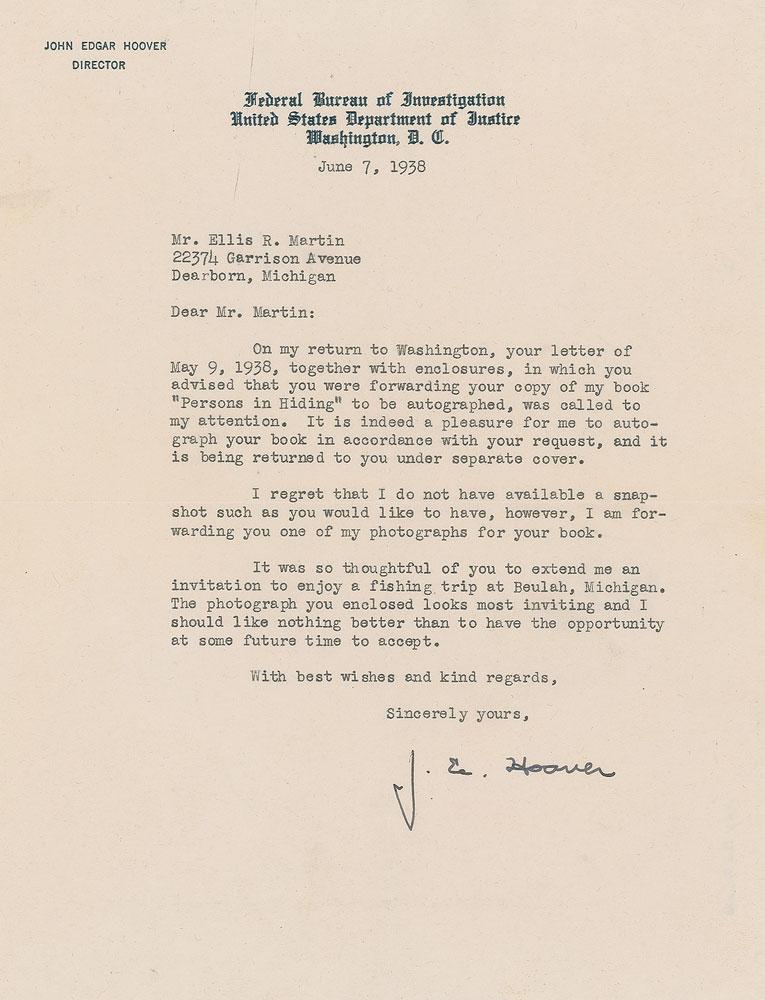 TLS signed “J. E. Hoover,” one page, 7 x 9.25, personal Federal Bureau of Investigation letterhead, June 7, 1938. Letter to Ellis R. Martin, forwarding him a photograph and a signed copy of the book Persons in Hiding, in part: "It was so thoughtful of you to extend me an invitation to enjoy a fishing trip at Beulah, Michigan. The photograph you enclosed looks most inviting and I should like nothing better than to have the opportunity at some future time to accept." In fine condition.