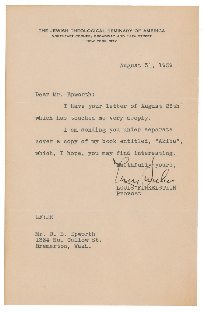 Talmud scholar and expert in Jewish law (1895-1991) who was a prominent leader of the Jewish Theological Seminary of America and Conservative Judaism. TLS, one page, 5.5 x 8.5, The Jewish Theological Seminary of America letterhead, August 31, 1939. Letter C. B. Epworth, in full: "I have your letter of August 26th which has touched me very deeply. I am sending you under separate cover a copy of my book entitled, 'Akiba,' which, I hope, you may find interesting." In fine condition.