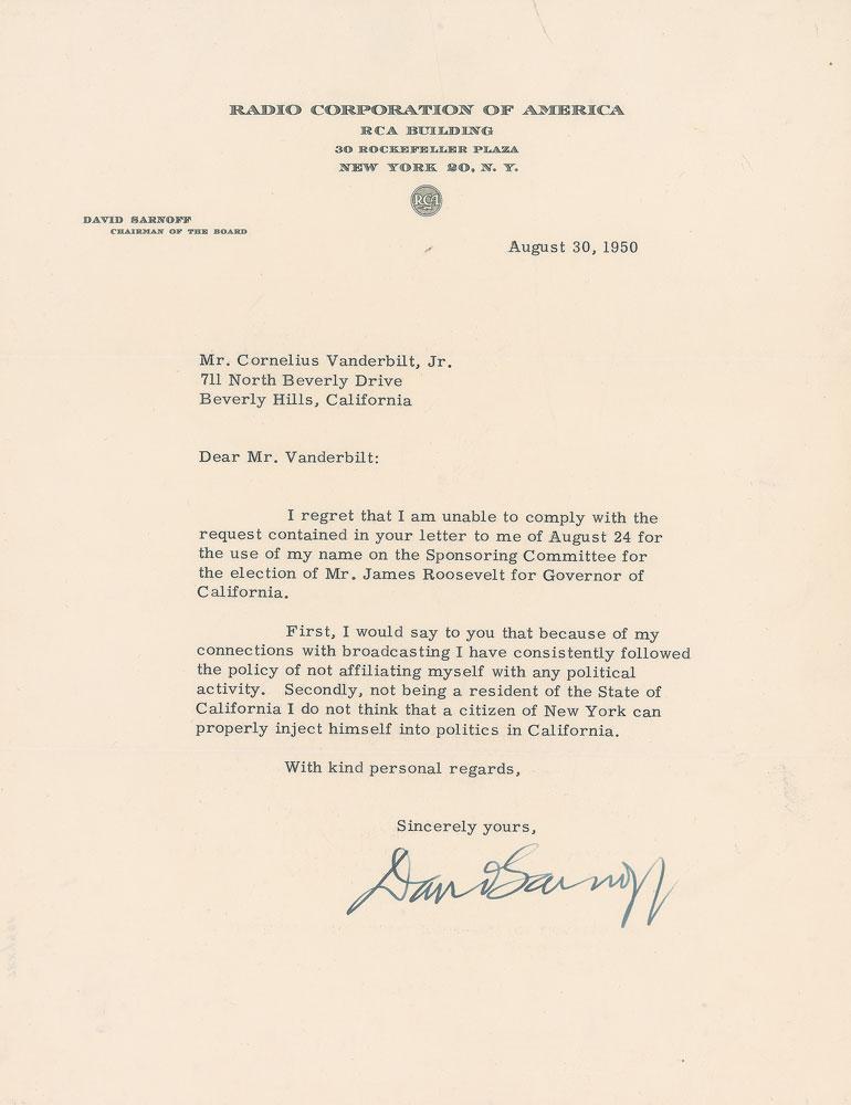 Russian-American businessman and pioneer of American radio and television (1891-1971) who ruled over an ever-growing telecommunications and media empire that included both RCA and NBC, and became one of the largest companies in the world. TLS, one page, 8.5 x 11, Radio Corporation of America letterhead, August 30, 1950. Letter to Cornelius Vanderbilt, Jr., in part: "I regret that I am unable to comply with the request?for use of my name on the Sponsoring Committee for the election of Mr. James Roosevelt for Governor of California. First, I would say to you that because of my connections with broadcasting I have consistently followed the policy of not affiliating myself with any political activity. Secondly, not being a resident of the State of California I do not think that a citizen of New York can properly inject himself into politics in California." In fine condition.
