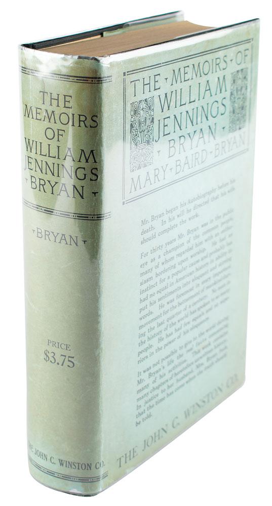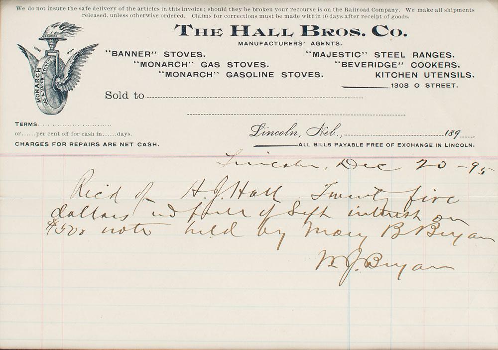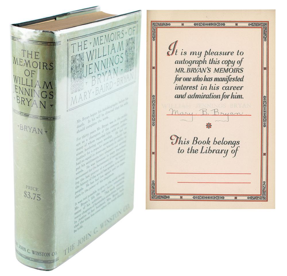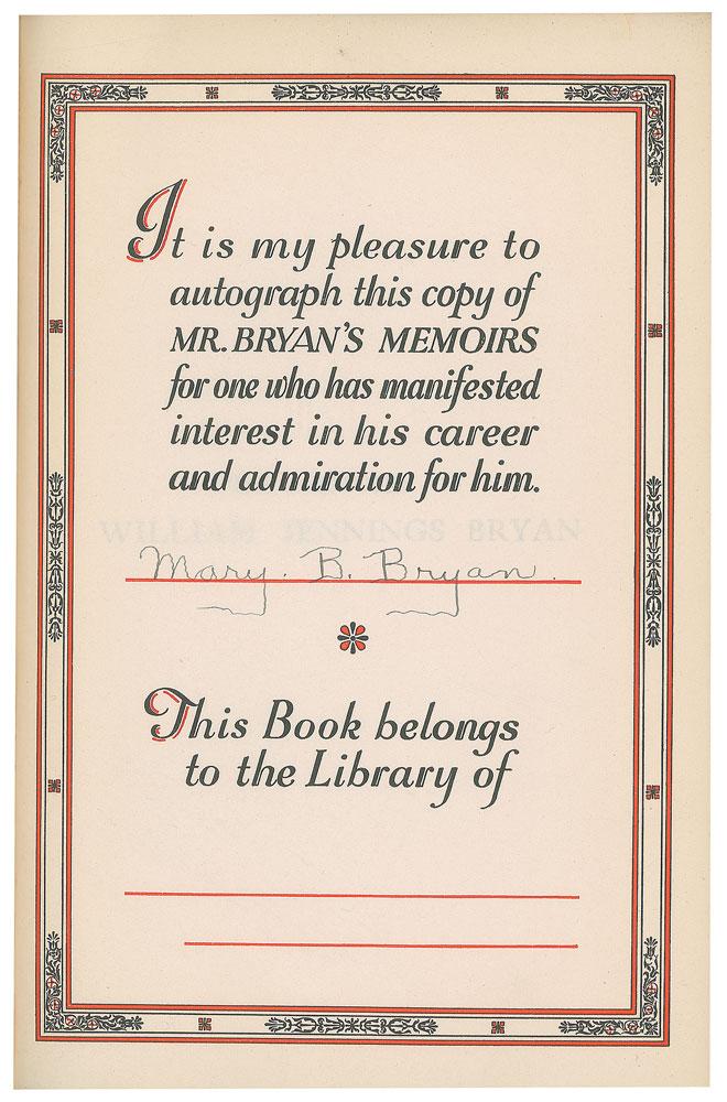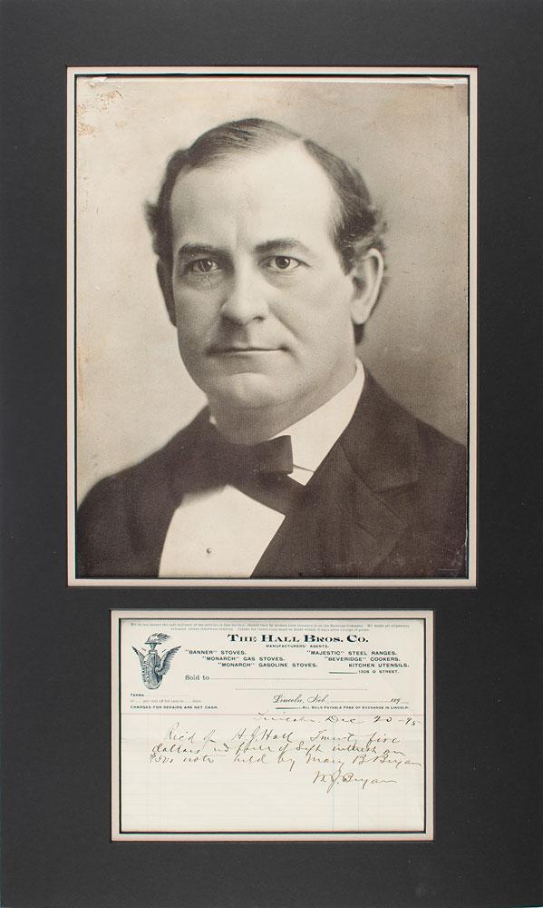 Partly-printed DS, signed “W. J. Bryan,” one page, 8.25 x 6, December 20, 1895. Handwritten receipt on The Hall Bros. Co. letterhead, in full: "Rec'd of H. J. Hall Twenty five dollars?of Sept. interest on $500 note held by Mary B. Bryan." Double-matted with a large portrait to an overall size of 15 x 25. In fine condition. Accompanied by a special edition of The Memoirs of William Jennings Bryan, signed on the colophon in ink by his wife, "Mary B. Bryan."
