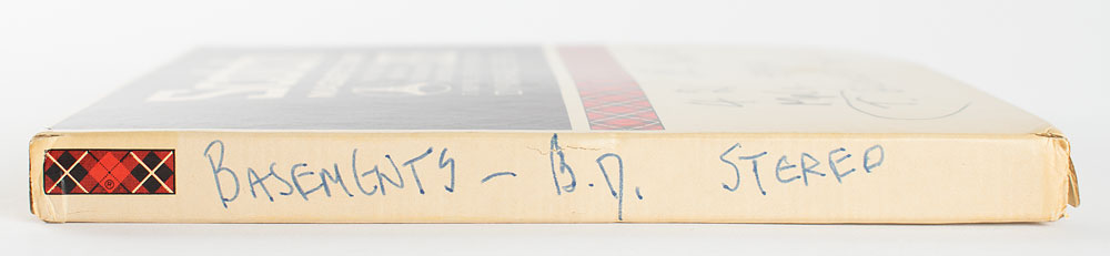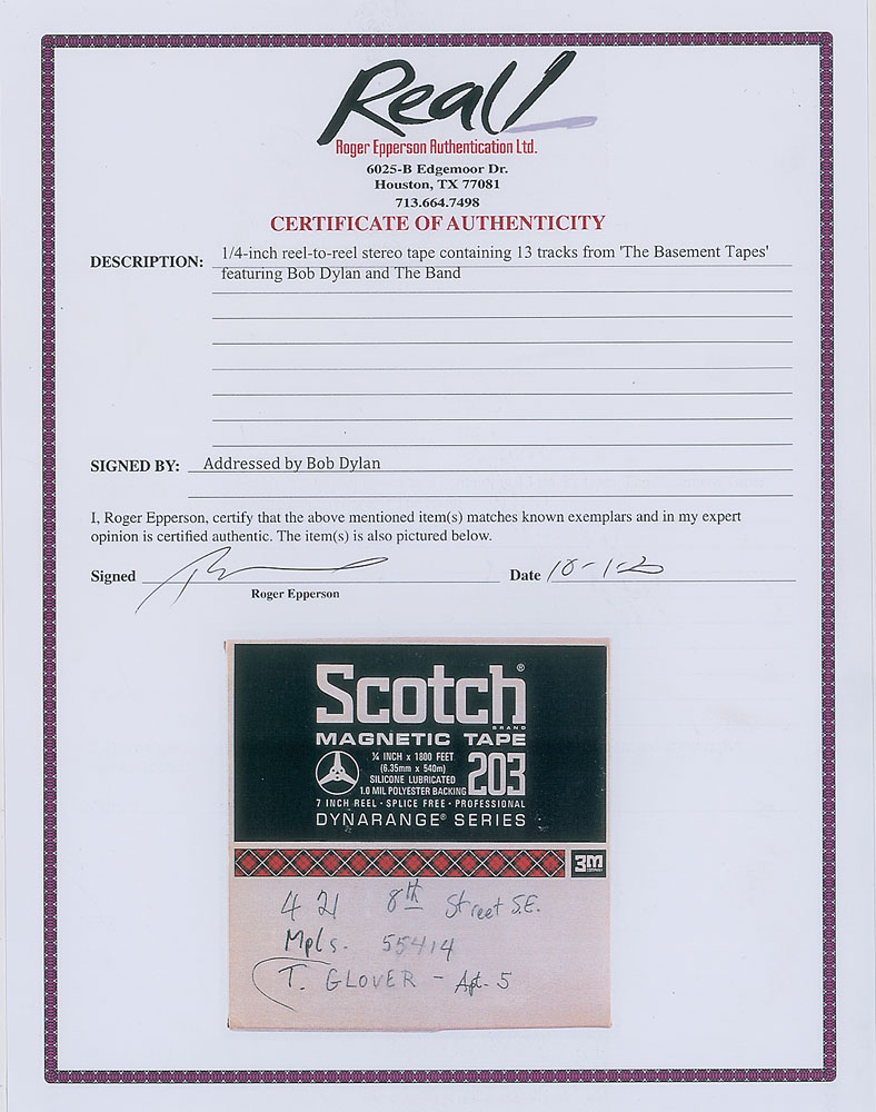 Rare 1/4-inch reel-to-reel stereo tape containing 13 tracks from 'The Basement Tapes' featuring Bob Dylan and The Band, in its original box hand-addressed on the front in black felt tip in Bob Dylan's hand with the address of Tony Glover: "421 8th Street S.E., Mpls. 55414, T. Glover - Apt. 5." Inside is a typed track list: "1. Million Dollar Bash, 2. Yea Heavy and a Bottle of Bread, 3. Please Mrs. Henry, 4. Down in the Flood, 5. Lo and Behold, 6. Tiny Montgomery, 7. This Wheel's on Fire, 8. You Ain't Goin' Nowhere, 9. I Shall Be Released, 10. Too Much of Nothing, 11. Tears of Rage, 12. Mighty Quinn, 13. Nothing Was Delivered." Glover has written "Basements - B.D. Stereo" on the spine, and also penned the track list on the back of the box. In fine condition.
