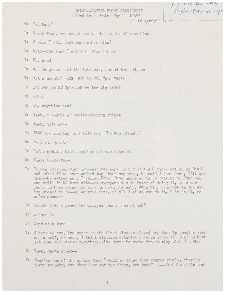 Accompanied by a full letter of authenticity from REAL and by a photocopy of Glover's transcript of a phone call with Dylan on May 21, 1969, in which they discuss this tape. Dylan asks Glover for his address, and warns him to make a copy of it before listening: "Its one of those first copies, and ahh, you don't wanna play this one too much."