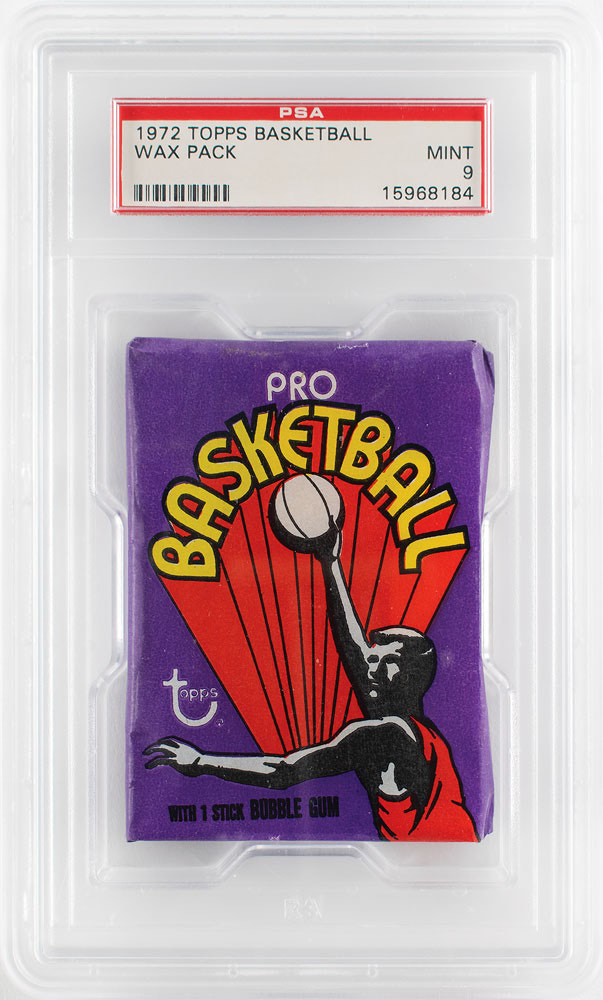 Graded by PSA MINT 9. None graded higher. The classic 1972-73 Topps basketball set is highlighted by rookies of Julius Erving, Artis Gilmore, and Phil Jackson, as well as cards of stars like Pete Maravich, Wilt Chamberlain, Oscar Robertson, Kareem Abdul-Jabbar, Rick Barry, Jerry West, Bob Lanier, Dave Cowens, Walt Frazier, John Havlicek, and Pat Riley. This well-preserved, MINT unopened wax pack contains ten cards and a stick of bubble gum, and offers the opportunity to pull any one of these classic cards.