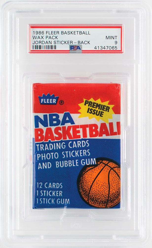 Graded by PSA MINT 9. None with a Jordan rookie sticker on the back have graded higher. The star-studded 1986-87 Fleer basketball set boasts the powerhouse rookie cards of Michael Jordan, Akeem Olajuwon, Charles Barkley, Karl Malone, and Patrick Ewing. Showing through the back of the wrapper is the text of the 1986 Fleer Sticker #8 Michael Jordan, a highly desirable and very undervalued alternate to his #57 rookie card. This mint unopened wax pack contains 12 cards plus one sticker (Jordan) and a stick of bubble gum, and offers the opportunity to pull one these valuable and iconic rookie cards in a high grade—with a Jordan sticker guaranteed!