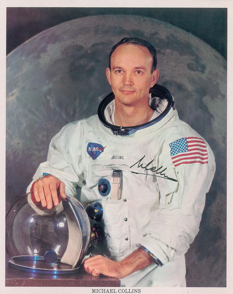 Official color 8 x 10 NASA lithograph of LMP Michael Collins posing in his white space suit against a lunar backdrop, signed in black felt tip, "M. Collins." In very good to fine condition, with a paperclip impression to the left edge, and a light horizontal bend.
