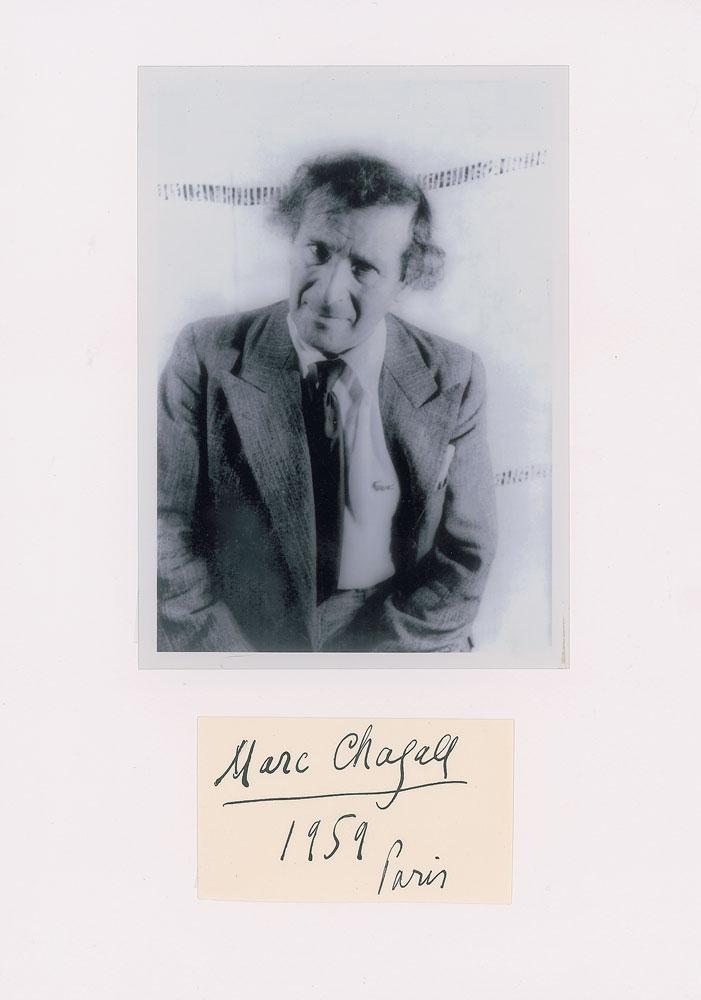 Bold ink signature, "Marc Chagall, 1959 Paris,” on an off-white 3.75 x 2 card, which is affixed to a white 8.25 x 11.75 mount bearing an attached portrait. In very fine condition.
