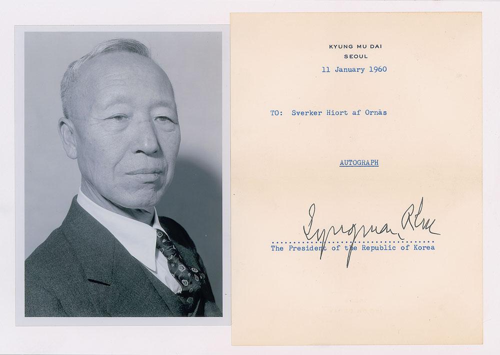 Vintage ink signature, "Syngman Rhee,” on an off-white 5.5 x 7.75 sheet of Kyung Mu Dai, Seoul letterhead, dated January 11, 1960. The sheet is affixed to a white 11.75 x 8.25 mount, which bears an attached portrait. In fine condition.