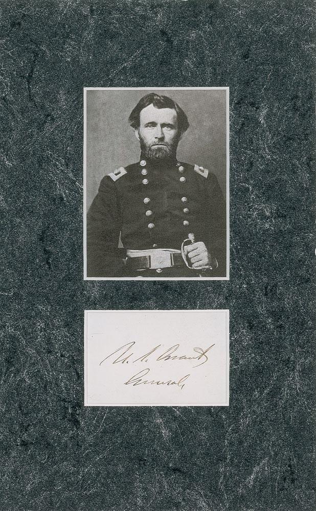 Ink signature, "U. S. Grant, General," on an off-white card, matted with an image of Grant in military uniform to an overall size of 7 x 11. In very fine condition.