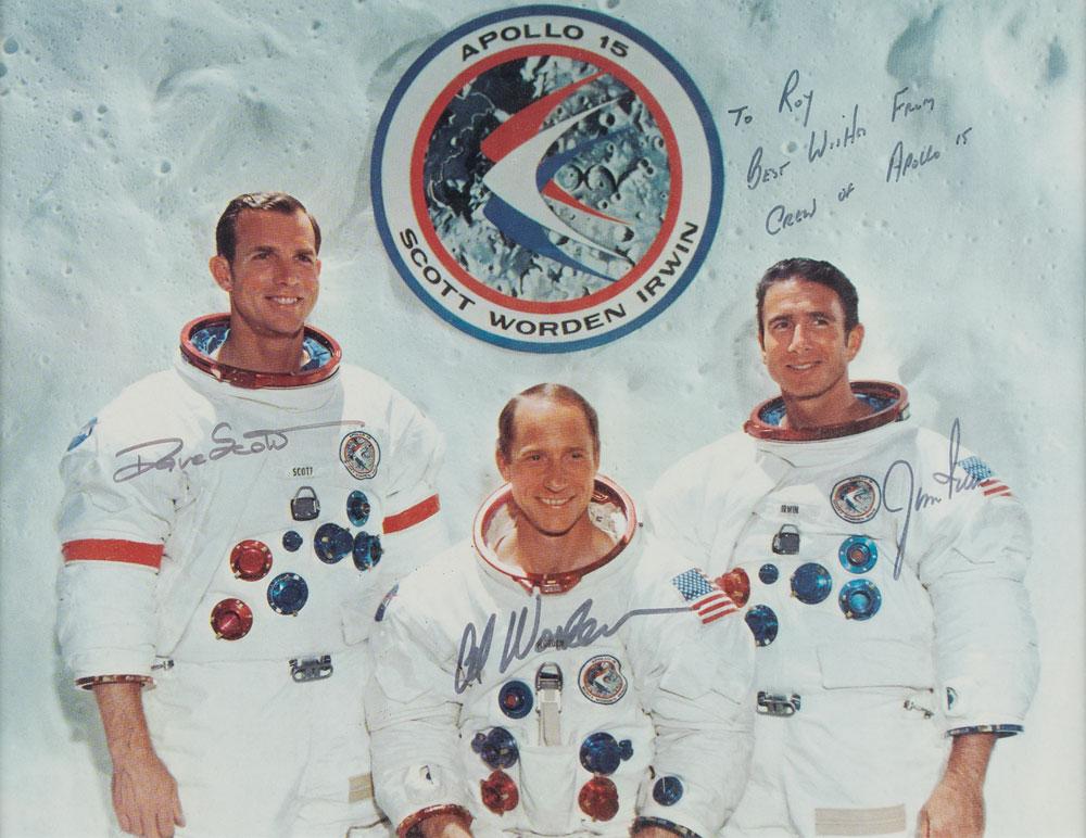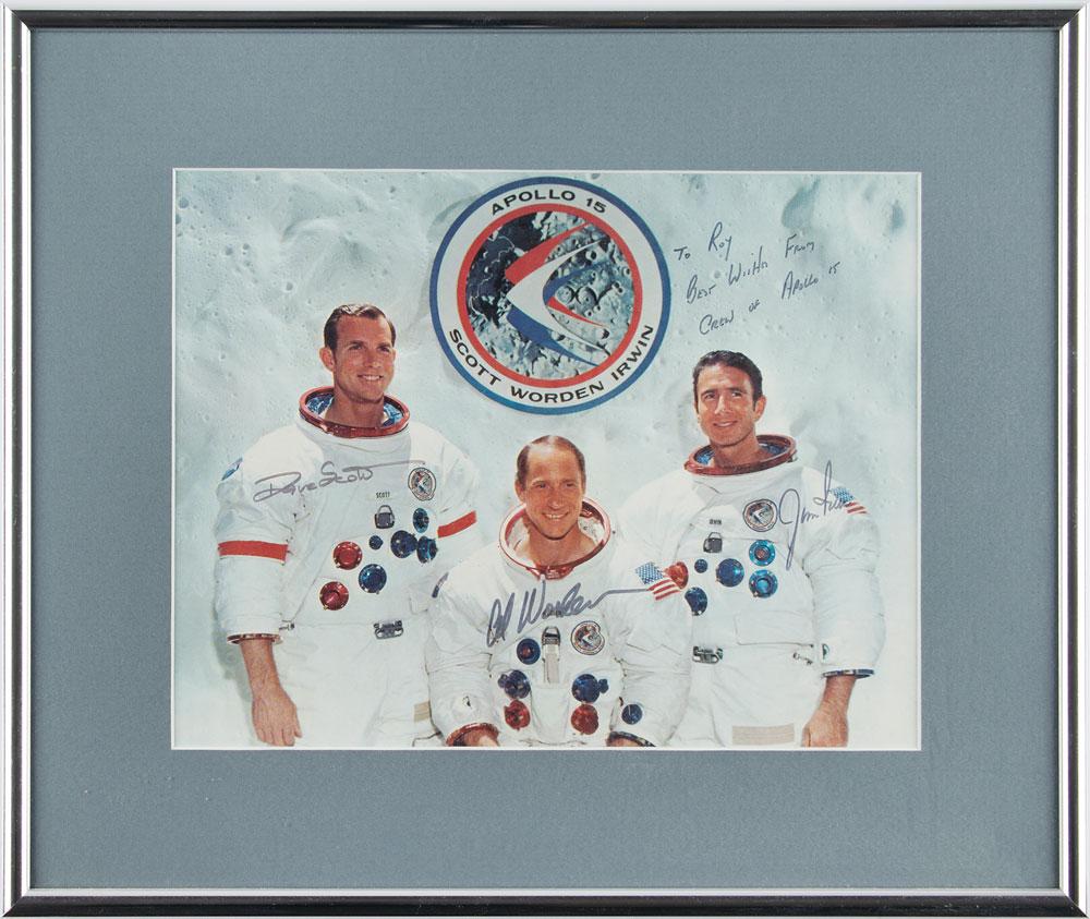 Color semi-glossy 9.25 x 7 photo of the Apollo 15 crew posing in their white space suits against a lunar background with their mission insignia, signed and inscribed in black felt tip, "To Roy, best wishes from the crew of Apollo 15, Jim Irwin," "Dave Scott," and "Al Worden.” Matted and framed to an overall size of 13.5 x 11.25. In fine condition.