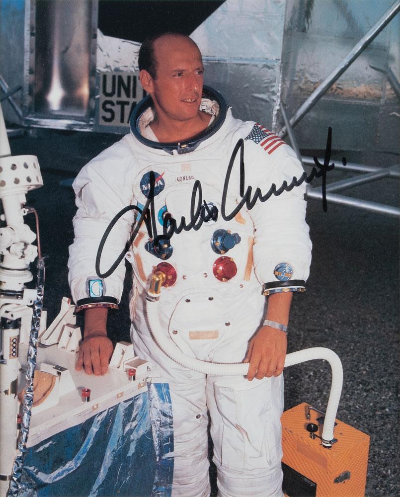 Color semi-glossy 7.25 x 9 photo of Commander Conrad wearing his white space suit prior to the Apollo 12 mission, signed in black felt tip, "Charles Conrad, Jr." Matted and framed to an overall size of 11.5 x 13.25. In fine condition.