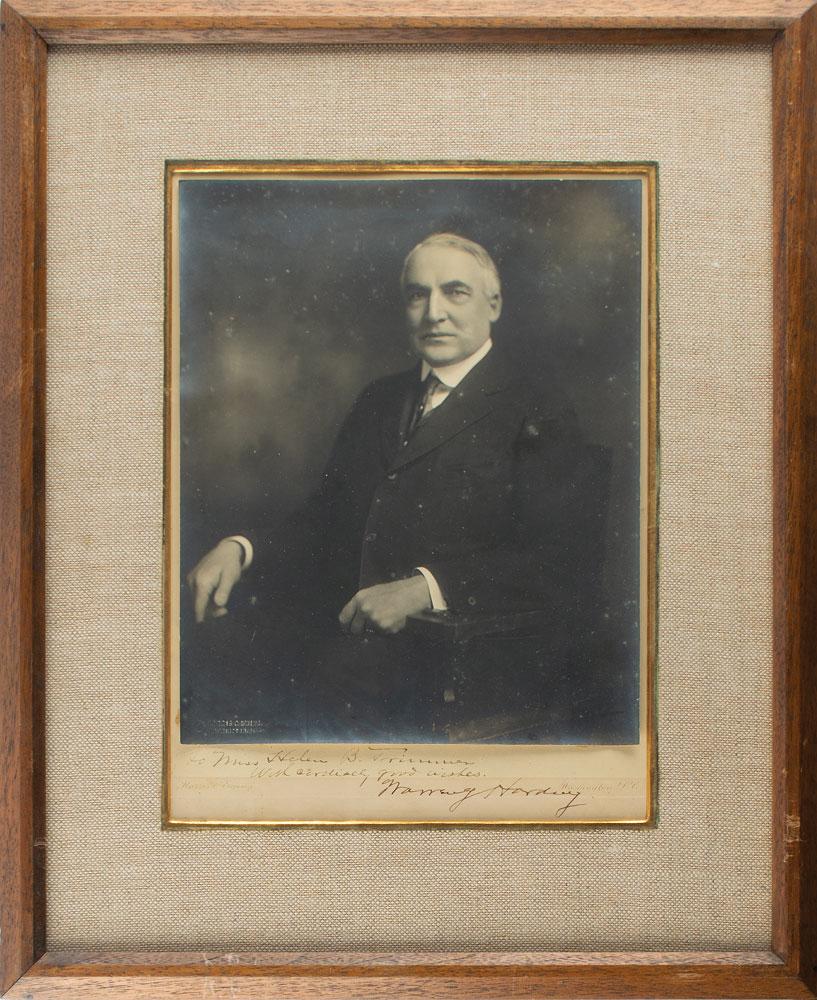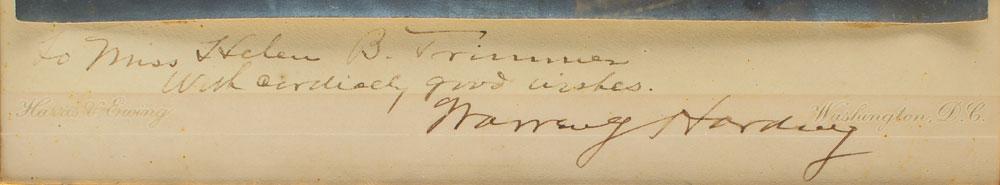 Vintage matte-finish 7.75 x 9.5 photo of Harding by Harris & Ewing, affixed to its original 8 x 11 mount, signed and inscribed on the mount in fountain pen, "To Miss Helen B. Trimmer, With cordial & good wishes, Warren G. Harding.” Cloth-matted and framed to an overall size of 13.5 x 17. In very good to fine condition, with light silvering to the perimeter of the image, which has slightly lifted from its mount.
