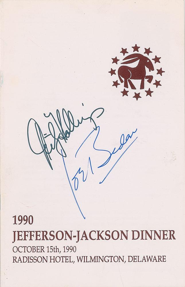 Program for the 1990 Jefferson-Jackson Dinner in Wilmington, Delaware, eight pages, 5.5 x 8.5, signed on the front cover in felt tip by Joe Biden and Fritz Hollings. In fine condition.
