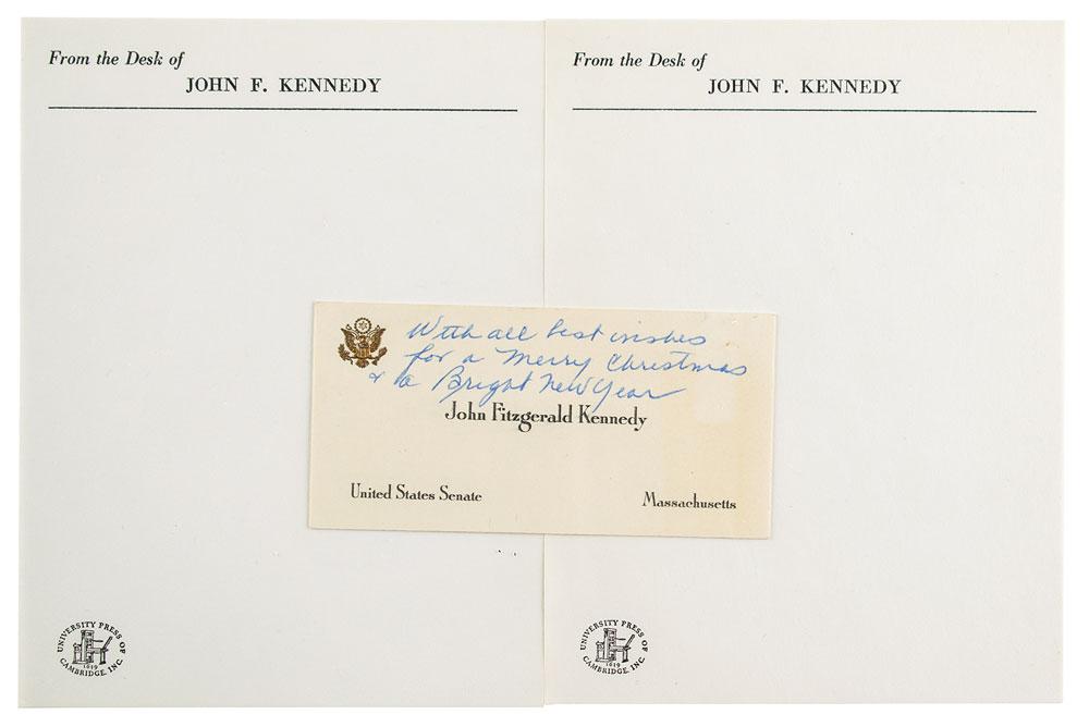 Three pieces of JFK ephemera, including: one of his personal 3.25 x 1.5 Senate calling cards imprinted "John Fitzgerald Kennedy, United States Senate, Massachusetts," with a note written in another hand; and two blank sheets of 4 x 5 "From the Desk of John F. Kennedy" memo paper. In fine condition.