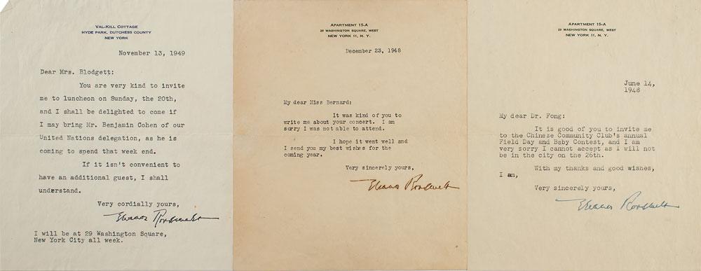 Three TLSs, each one page, 6 x 7, dated 1948-1949. Roosevelt declines an invitation to "the Chinese Community Club's annual Field Day and Baby Contest," regrets being unable to attend a concert, and accepts an invitation to a luncheon, asking if she "may bring Mr. Benjamin Cohen of our United Nations delegation, as his is coming to spend that week end." In fine condition. Accompanied by all three original mailing envelopes, all bearing stamped free franks.