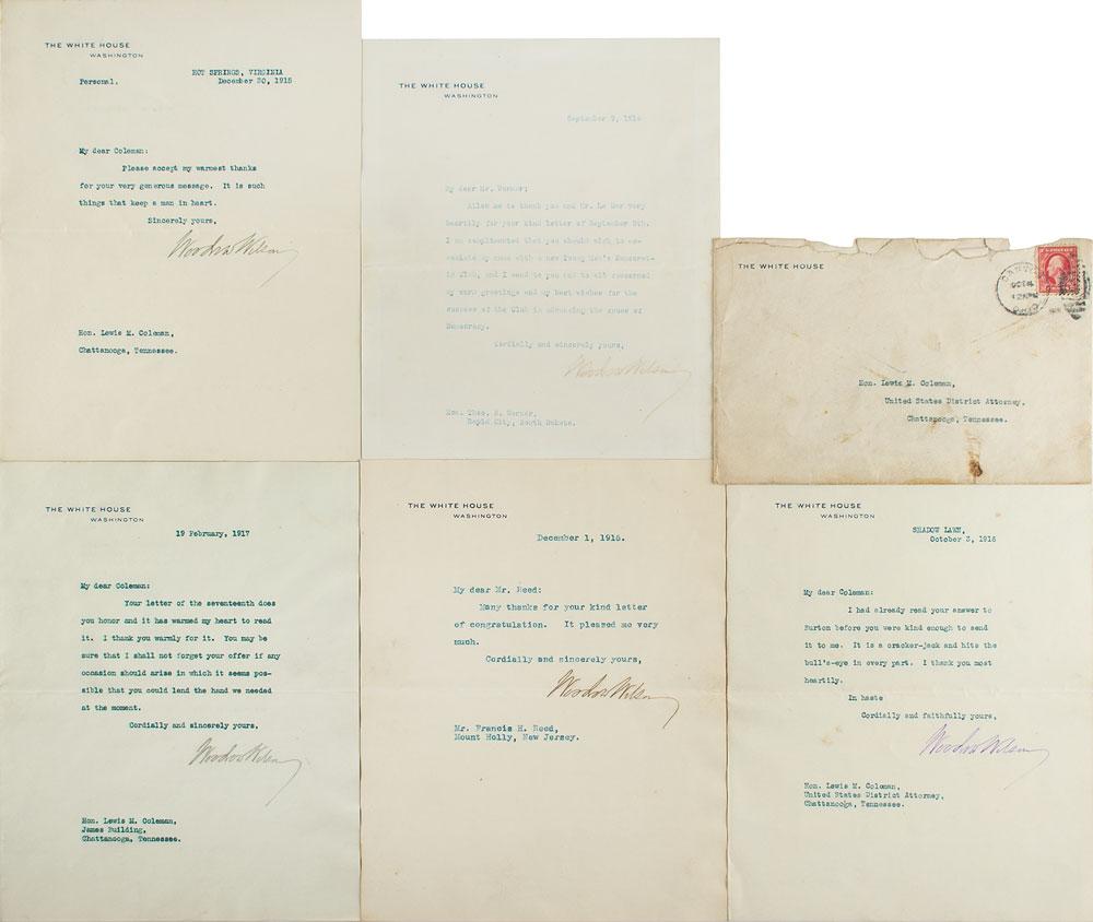 Five TLSs as president, each one page, White House letterhead, dated from 1914 to 1917. Includes:
