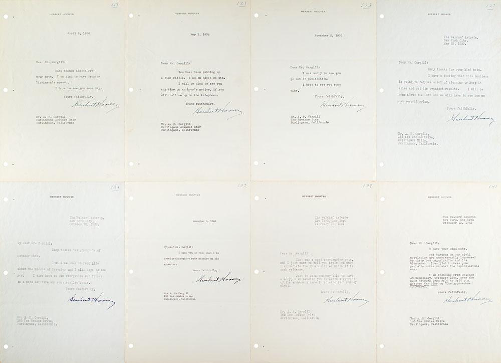 Eight TLSs, each one page, personal letterhead, 7.25 x 10.5, dated 1936 to 1942, all to A. B. Cargill. Hoover sends thanks for correspondence, notes that a business "is going to require a lot of plugging to keep it alive and get the greatest results," forwards "a reprint of the address I made in Chicago," and observes: "The burdens on our civil population are unnecessarily increased by their bad organization and its blunders." In fine condition, with three file holes to the left edge of each letter.