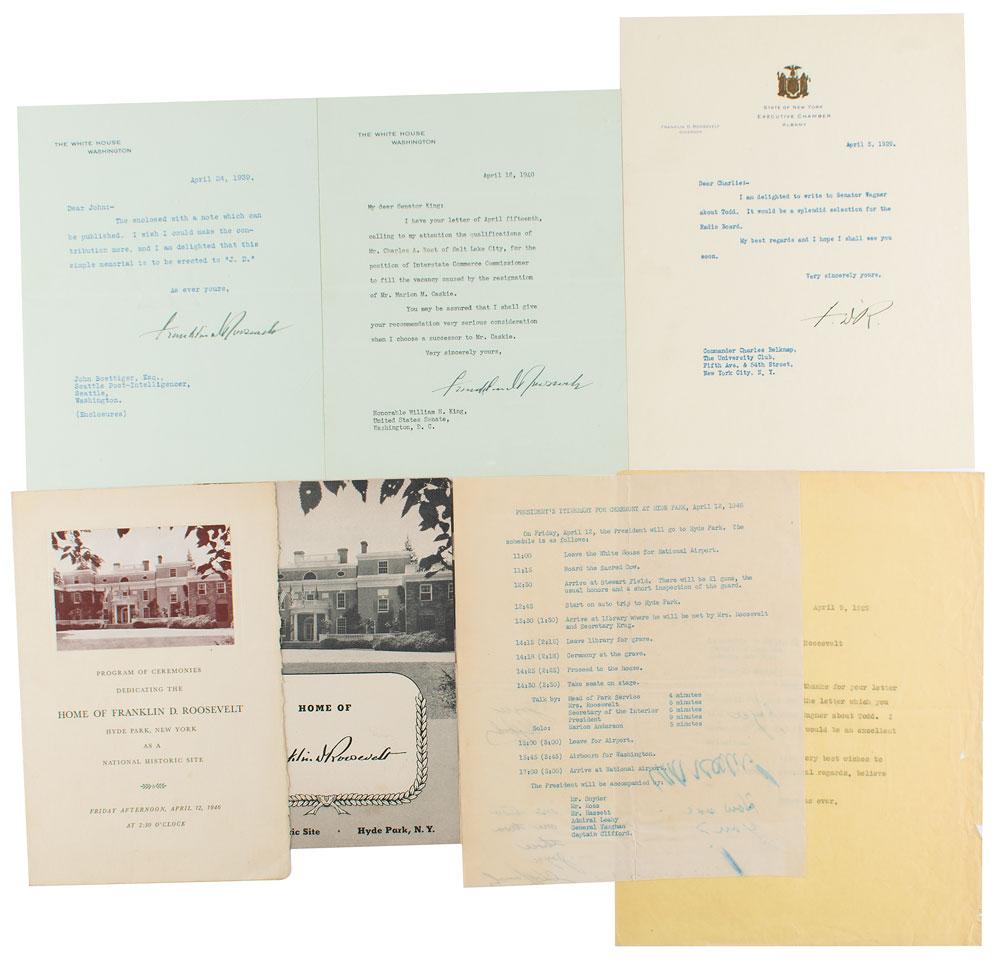 In overall fine condition. Accompanied by a program for the 1946 dedication of the home of Franklin D. Roosevelt as a national historic site, a booklet about the home, and an original typed sheet headed "President's Itinerary for Ceremony at Hyde Park, April 12, 1946."
