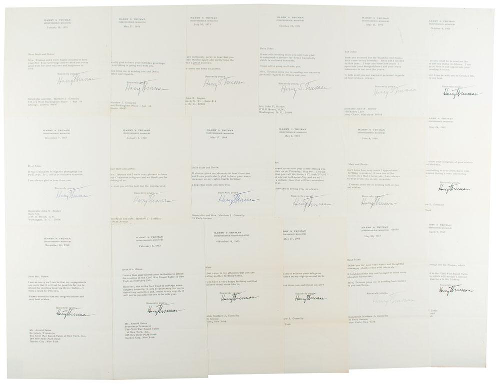 Collection of 18 TLSs, each one page, 7.25 x 10.5, personal letterhead, dated from 1965 to 1972. Truman exchanges pleasantries, sends thanks for gifts and birthday wishes, and offers good wishes to his friend and former Secretary of the Treasury John W. Snyder before an eye operation. In addition to Snyder, other recipients include his former White House secretary Matthew J. Connelly, Arnold Gates of the Civil War Round Table, and others. In overall fine condition. Accompanied by one original mailing envelope, bearing a pre-printed free frank.