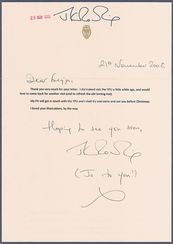 TLS, one page, 8 x 11.5, personal letterhead with her personal J. K. Rowling letterhead, November 21, 2008. In part: "I did indeed visit the YPU a little while ago, and would love to come back for another visit (and to refresh the old Sorting Hat). My PA will get in touch with the YPU and I shall try and come and see you before Christmas." She signs with a warm handwritten closing: "Hoping to see you soon, J. K. Rowling, (Jo to you!)." The letter is also dated and addressed to "Freyja" in Rowling's own hand. In fine condition. Accompanied by a full letter of authenticity from Beckett Authentication Services.