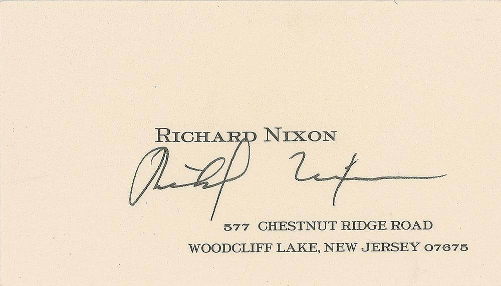 Personal off-white 3.5 x 2 business card belonging to Richard Nixon, who signs in black ink. In very fine condition. Consignor notes that this card was signed at the American Embassy in Moscow in the spring of 1994, when Nixon spoke to a group of Russian lawmakers at the State Duma on March 14, 1994. Nixon would pass away a month later at the age of 81.