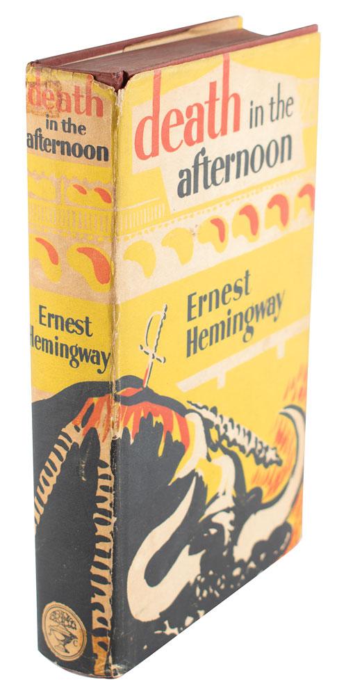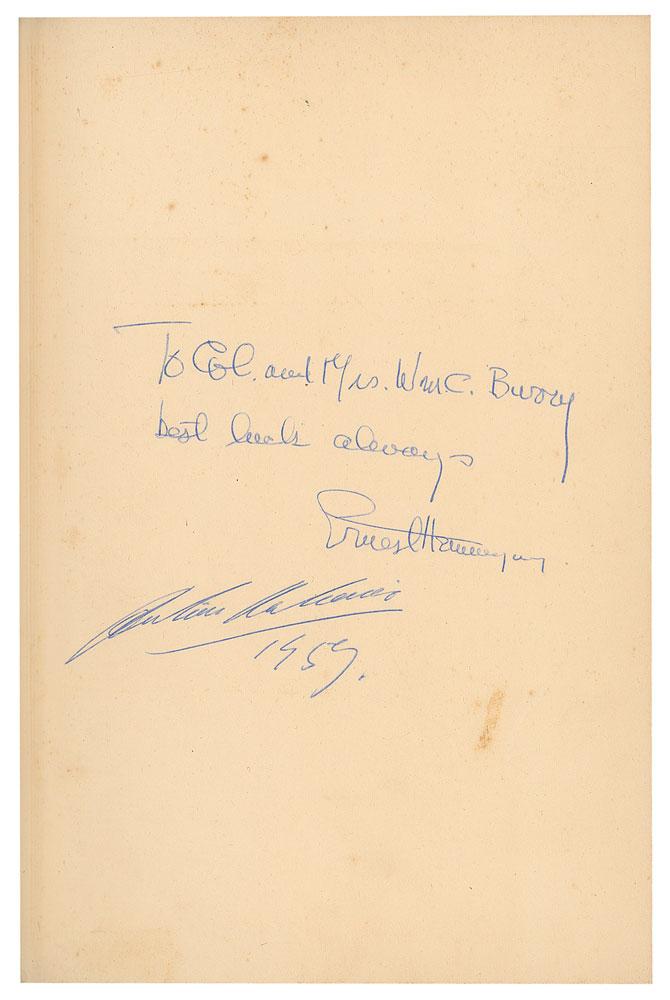 Signed book: Death in the Afternoon. Later printing. London: Jonathan Cape, 1956. Hardcover with dust jacket, 6 x 8.75, 358 pages. Signed and inscribed on the first free end page in blue ballpoint, "To Col. and Mrs. W. C. Burry, best luck always, Ernest Hemingway." The page is also signed by famed Spanish bullfighter Antonio Ordóñez, who is profiled in the book. Autographic condition: fine condition, with a few small stains to the signed page. Book condition: VG/VG, with foxing to fore-edge, edgewear to dust jacket, and a few splits to the jacket's spine ends repaired with old tape. Accompanied by a vintage newspaper clipping of Hemingway with Ordóñez.