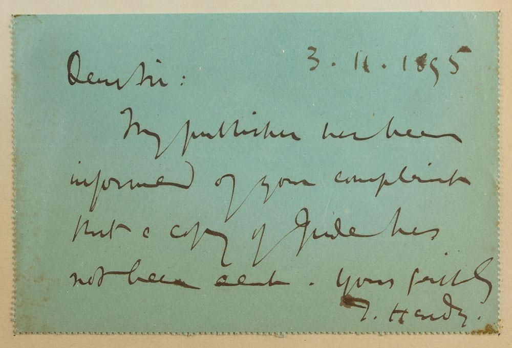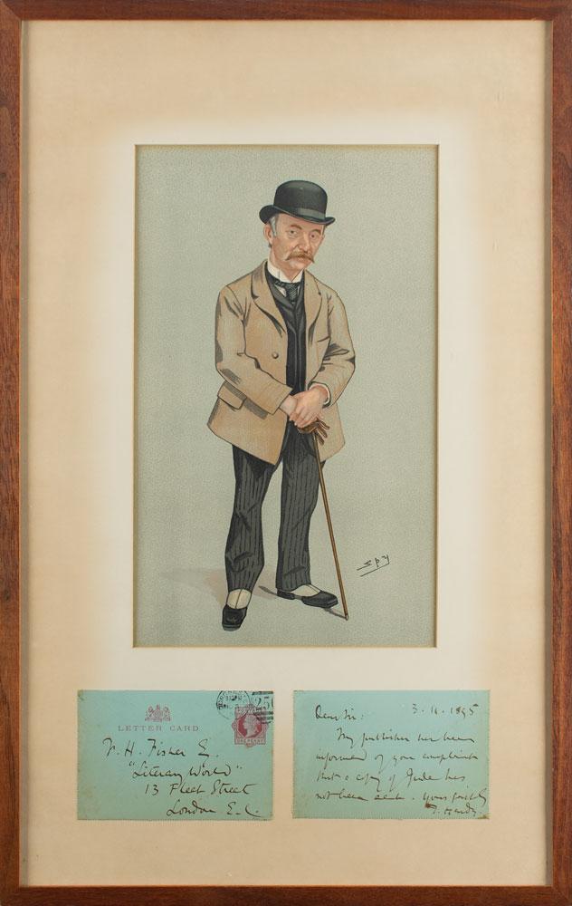 ALS signed “T. Hardy,” one page, 4.75 x 3, March 11, 1895. Brief letter to Mr. Fisher of "Literary World," in full: "My publisher has been informed of your complaint that a copy of Jude has not been sent." The letter card and its respective cover, which has been addressed in Hardy's hand, are both mounted and framed with a vintage Vanity Fair lithograph of Thomas Hardy by artist Leslie Ward to an overall size of 14 x 22.25. In fine condition, with toning to the mat. Jude the Obscure, Hardy's last completed novel, was first published in book form in 1895. Delving into issues of class, education, religion, morality, and marriage, the novel earned its share of controversy and was deemed by at least one reviewer as 'Jude the Obscene.'