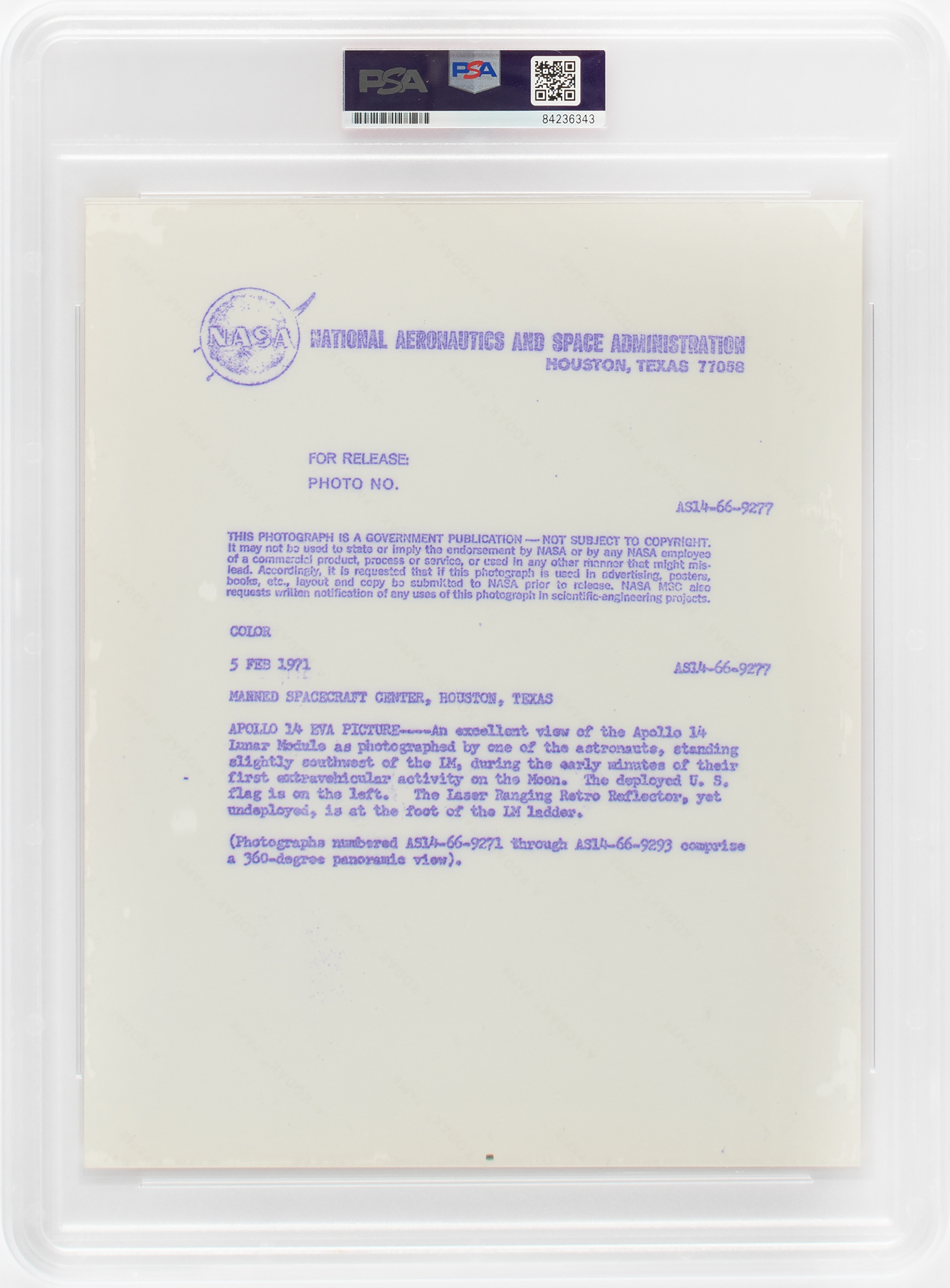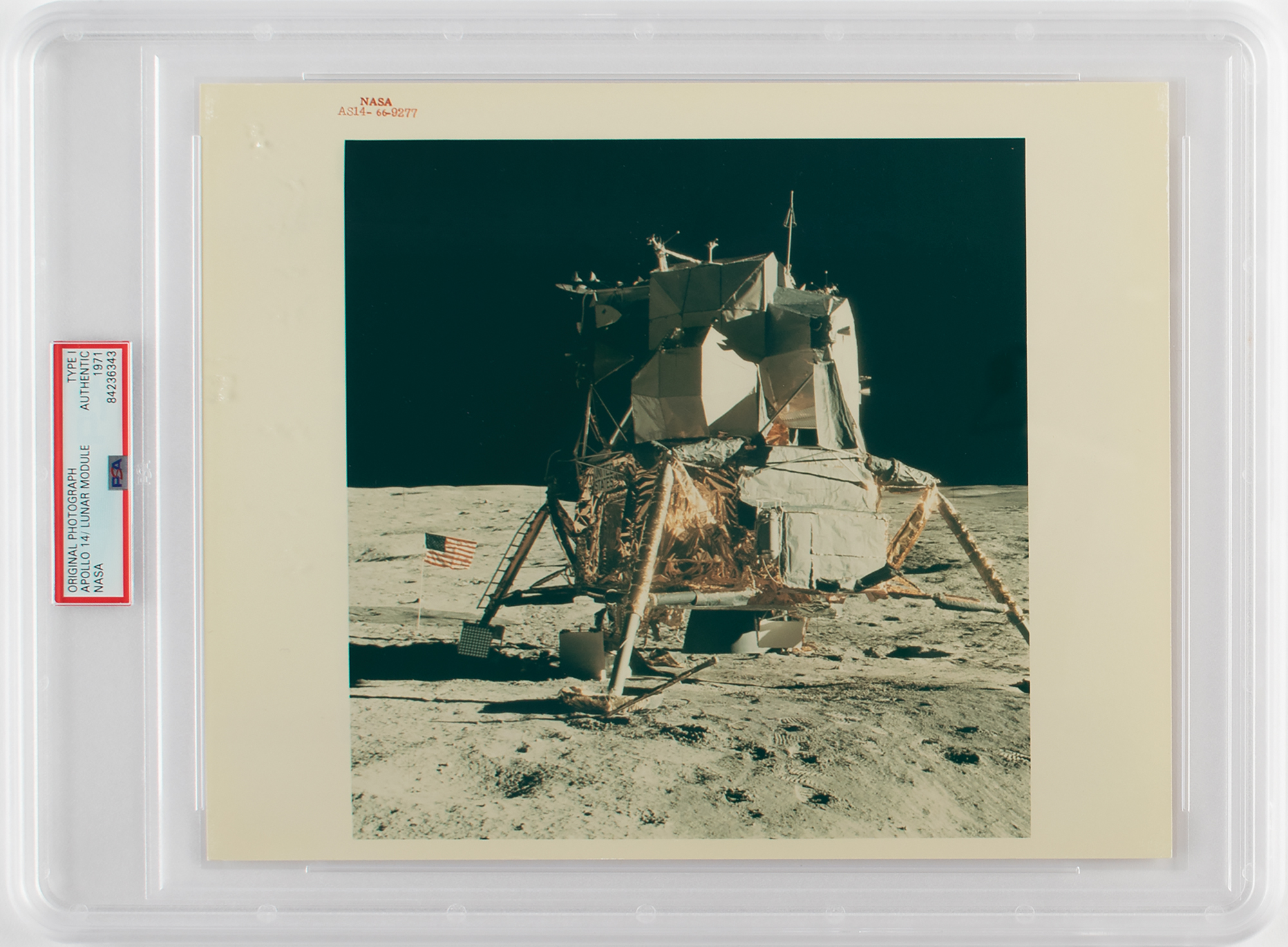 Official color glossy 10 x 8 red-numbered NASA photo (AS14-66-9277), which shows an excellent view of the Apollo 14 Lunar Module beside the American flag on the surface of the moon. Reverse bears "A Kodak Paper" watermarks and purple NASA caption text. In fine condition, with a small crease in the top border. Encapsulated by PSA as an authentic 'Type I' photograph. From The Gene Kranz Collection. Kranz served as a flight director for Apollo 14.