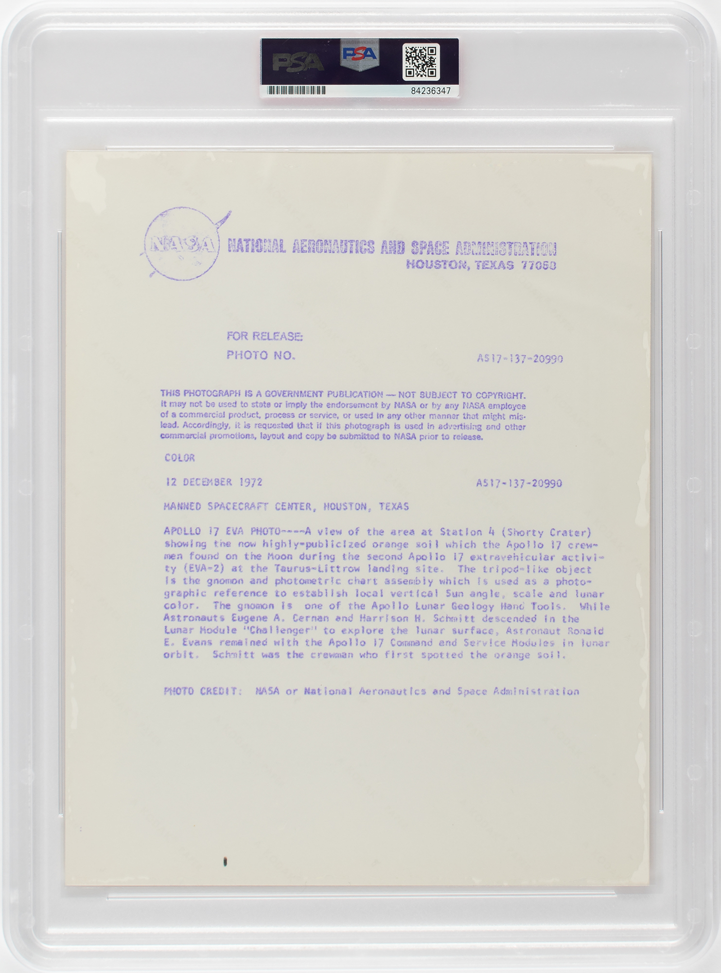 Official color glossy 10 x 8 red-numbered NASA photo (AS17-137-20990), which shows Station 4 at Shorty Crater, where an orange soil was discovered during Apollo 17 EVA-2. Reverse bears "A Kodak Paper" watermarks and purple NASA caption text. In very fine condition. Encapsulated by PSA as an authentic 'Type I' photograph. From The Gene Kranz Collection. Kranz served as a flight director for Apollo 17.