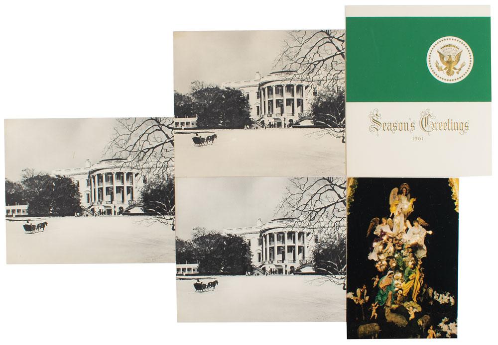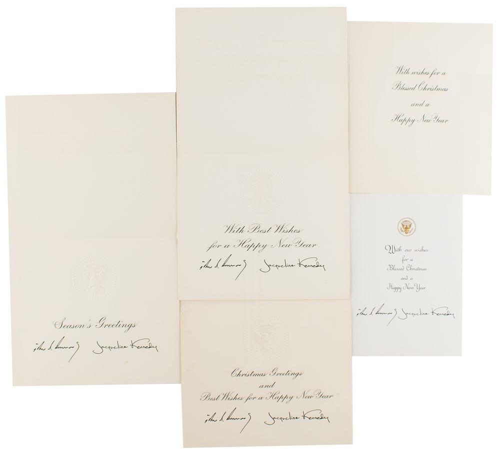 Great collection of five Christmas cards from the Kennedy White House, including: the 1961 "Season's Greetings" card; three varieties of the 1962 card, all with facsimile signatures, with "Season's Greetings," "With Best Wishes for a Happy New Year," and "Christmas Greetings and a Happy New Year" printed inside; and the 1963 card, featuring facsimile signatures and "With our wishes for a Blessed Christmas and a Happy New Year" printed inside. In fine condition. The Kennedy administration had holiday greeting cards printed with different messages to accommodate the beliefs of the recipients; the 1963 card tragically went unsent, as President Kennedy was killed in November.