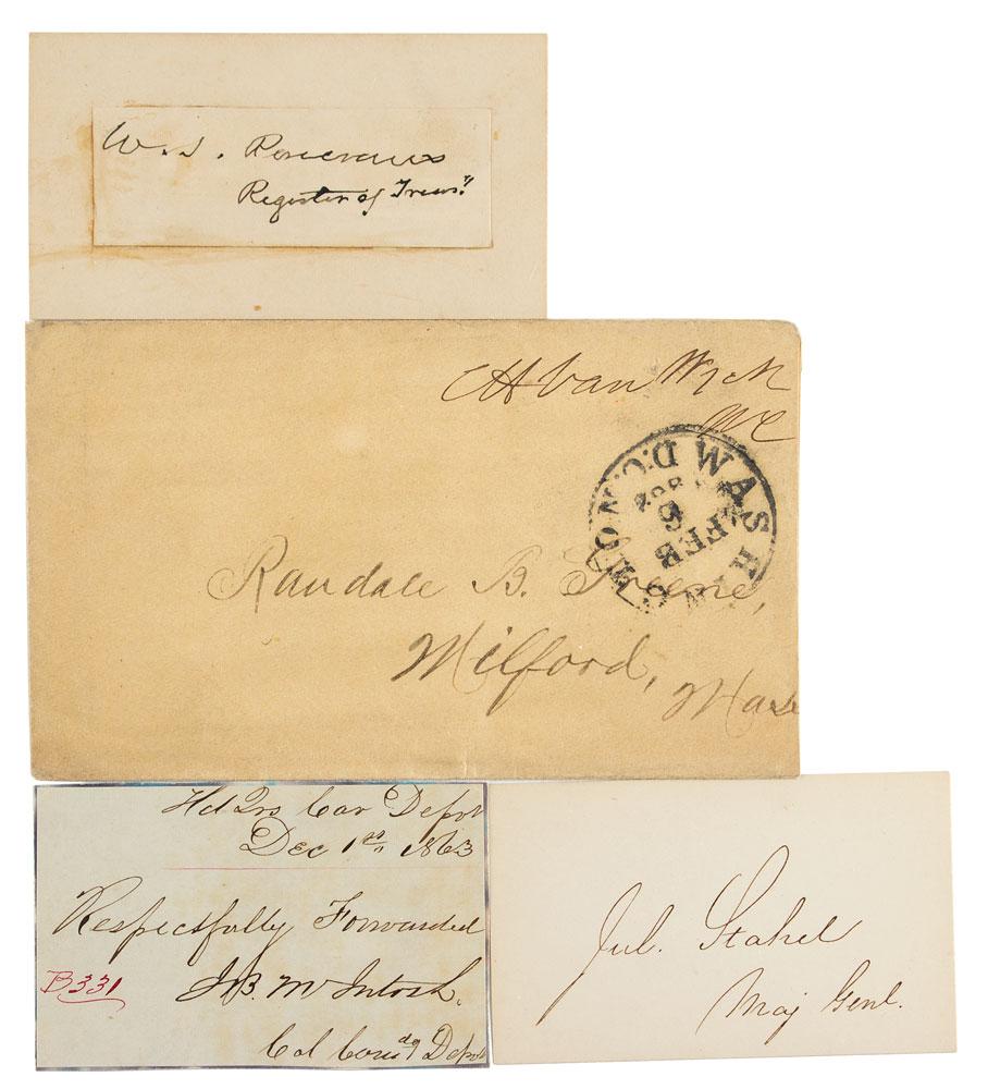 Four items signed by Union generals, including: William Rosecrans (signature), Julius Stahel (signature), John B. McIntosh (war-dated endorsement, December 1, 1863), and Charles Van Wyck (free franked mailing envelope). In overall fine condition.