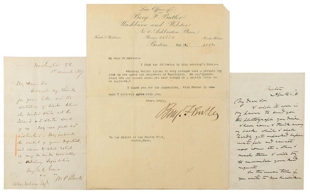 Three letters by Union generals from Massachusetts, including: Nathaniel P. Banks (ALS, March 1, 1867: "Accept my thanks for your letter and the statistics?between the United States and the Islands and states south of us"); Charles Devens (ALS, April 24, 1881: "I wish it were in my power to send you the photograph you desire. I have some I think among my books, which I shall hardly get unpacked before next fall"); and Benjamin F. Butler (TLS, May 14, 1889, to the editor of the Boston Post: "I find the following in this morning's Post:— 'General Butler thinks it very strange that a certain log book is not among the archives at Washington. He can't understand how any vessel could get near enough to a hostile force to be captured.' I thank you for the suggestion. With Porter in command I entirely agree with you"). In overall fine condition, with light staining and a missing corner tip to the Butler letter.