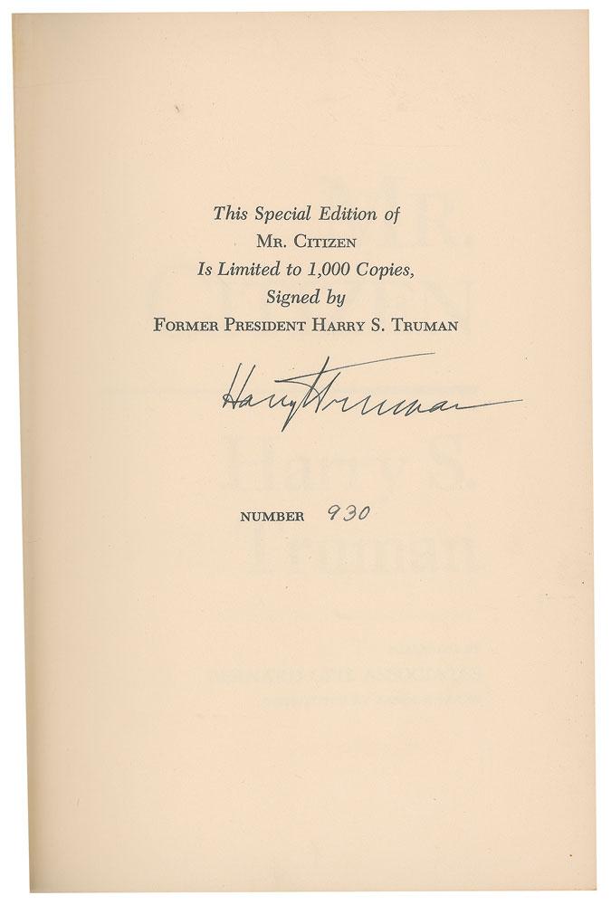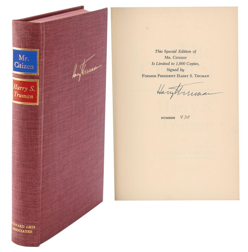 Signed book: Mr. Citizen. Limited special edition, numbered 497/1000. NY: Bernard Geis Associates, 1960. Hardcover with slipcase, 6.25 x 9.25, 315 pages. Signed on the colophon in fountain pen by Harry S. Truman. Autographic condition: very fine. Book condition: VG+/None in a VG slipcase, with edgewear, rubbing, and toning to slipcase.