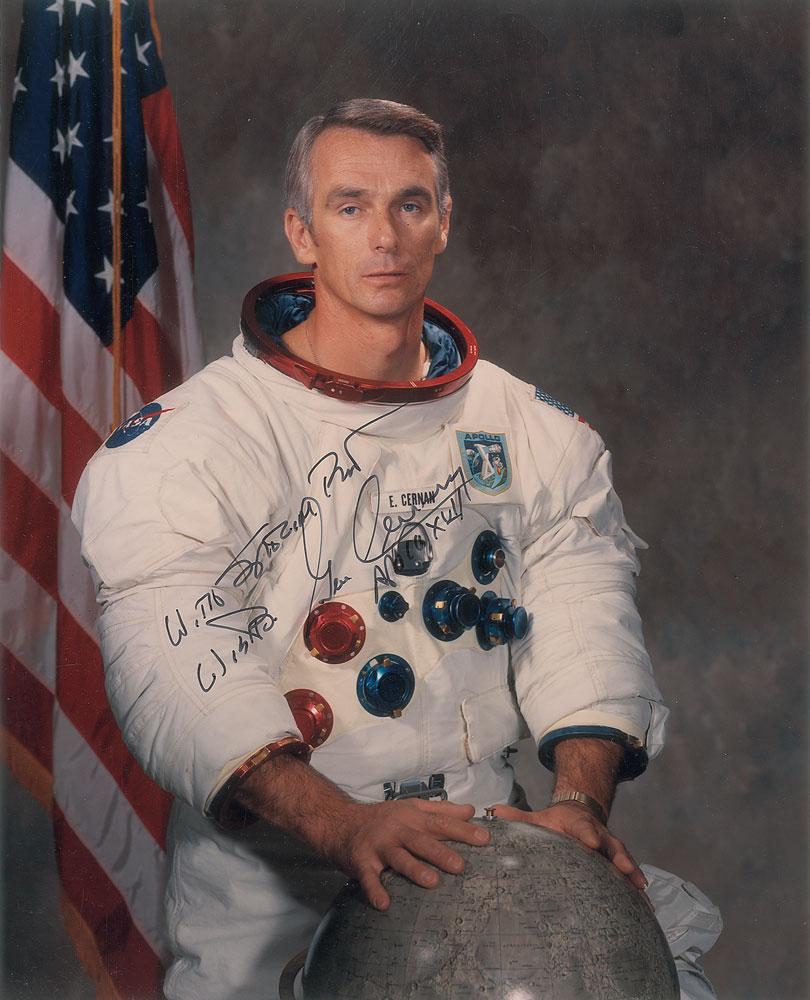 Color semi-glossy 8 x 10 photo of Cernan wearing his white space suit with Apollo 10 patch, signed in black felt tip, "With sincere best wishes, Gene Cernan, Apollo XVII." In fine condition.