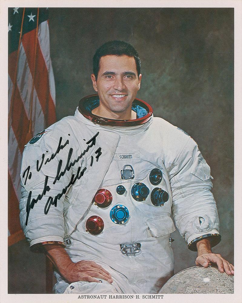 Official color 8 x 10 NASA lithograph of Harrison Schmitt posing in his white space suit with a lunar globe, signed and inscribed in black felt tip, "To Vicki, Jack Schmitt, Apollo 17.” In fine condition, with a crease above his head.
