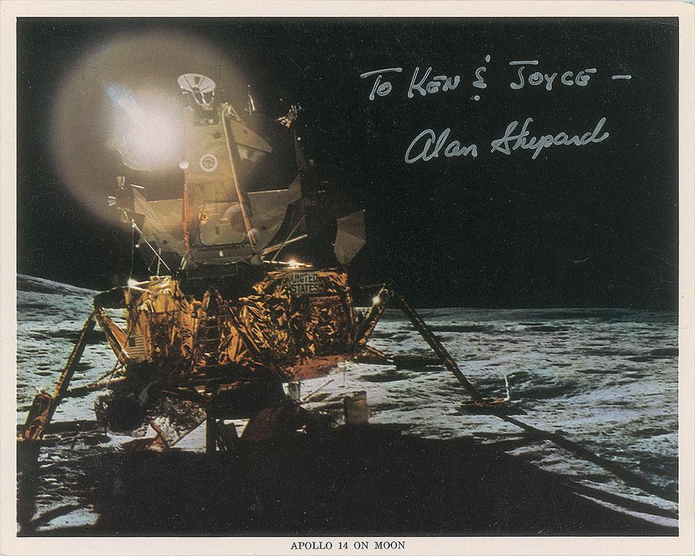 Official color 10 x 8 NASA lithograph of the Lunar Module Antares resting on the moon's surface during the Apollo 14 mission, signed and inscribed in silver ink, "To Ken & Joyce—Alan Shepard.” Typed collector's notations on reverse indicate that the signature was obtained in August 1990. In fine condition, with a few light creases and a light paperclip impression to the top edge.