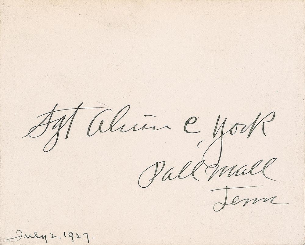 Attractive vintage ink signature, "Sgt. Alvin C. York, Pall Mall, Tenn,” on an off-white 4.25 x 3.5 card, which is dated below to July 2, 1927. In fine condition. York was raised in Pall Mall, a small community in the Wolf River valley of Fentress County, Tennessee, which features the Sgt. Alvin C. York State Historic Park.
