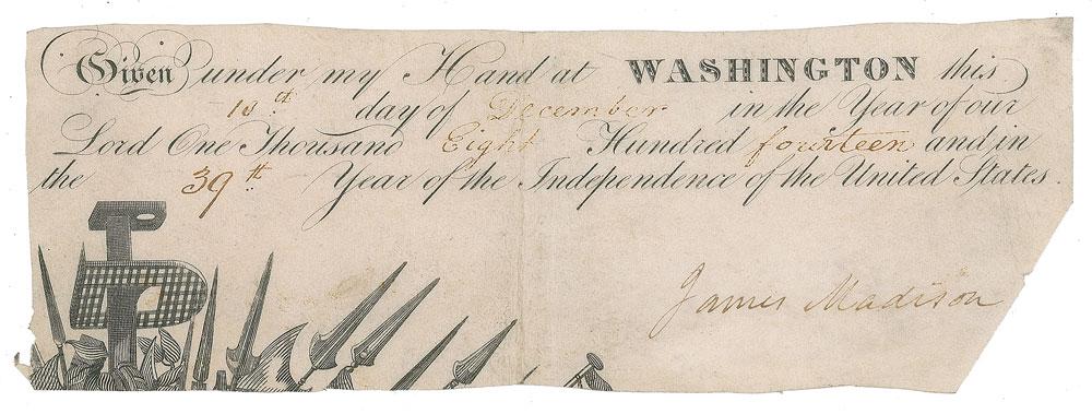 Ink signature as president, "James Madison,” on an off-white 7.5 x 2.5 vellum sheet clipped from the close of a document dated to December 10, 1814. In fine condition.