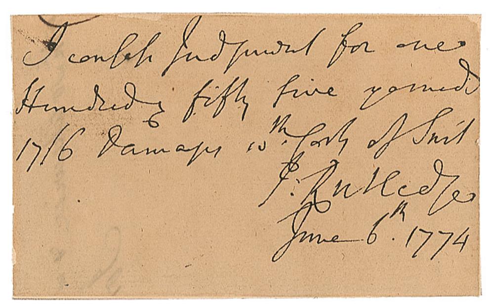 Statesman (1739-1800), who served as the first governor of South Carolina following the signing of the United States Constitution, and was the second chief justice of the Supreme Court. Rare ANS signed “J. Rutledge,” one page, 4 x 2.25, June 6, 1774. Partial legal document, in part: "I confess Judgment for one Hundred & fifty five?Damages?of Suit." Affixed to a same-size card and in fine condition. Accompanied by an unsigned engraved portrait.