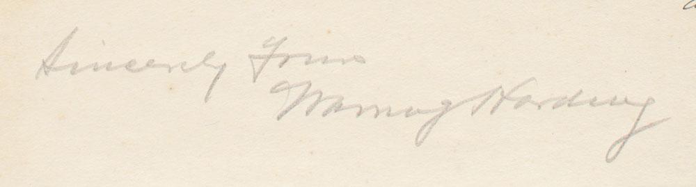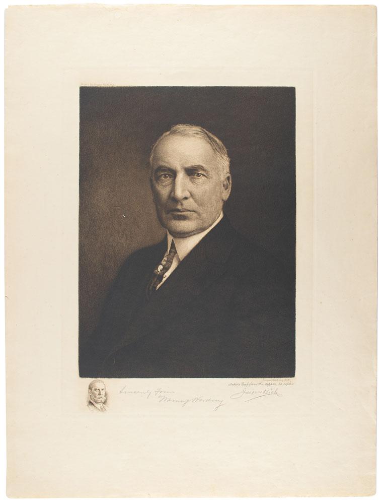 Terrific circa 1922 print of Warren G. Harding by Hungarian portrait etcher Jacques Reich, 18.75 x 25.25, signed in the lower border in pencil, "Sincerely yours, Warren G. Harding," and by the artist, who writes, "Artist's proof from the copper, 30 copies." In fine condition, with a small stain to the top edge.