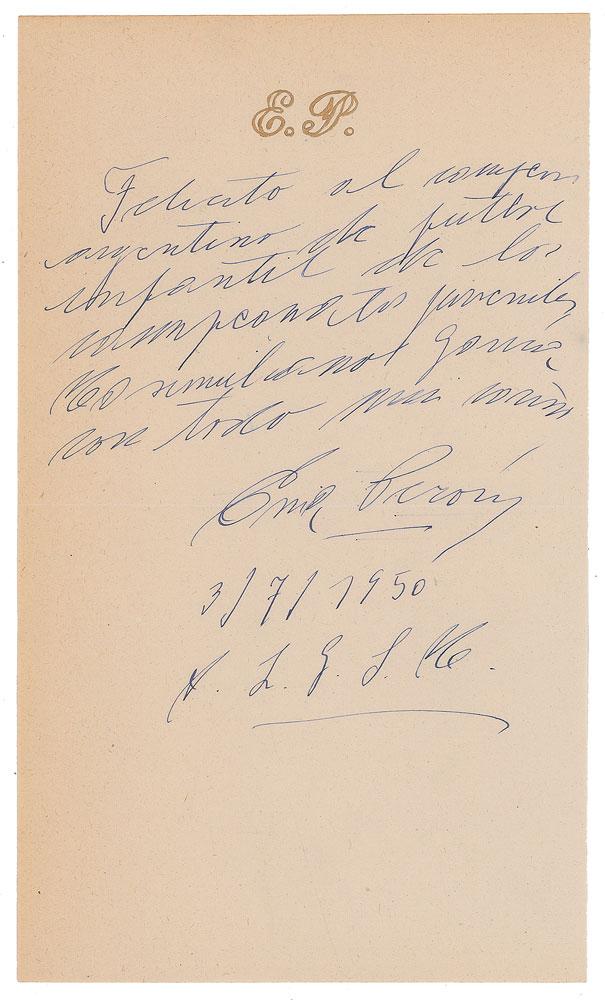 ALS in Spanish, one page, 5 x 8.5, personal monogram letterhead, July 3, 1950. Untranslated letter nicely penned by the beloved First Lady of Argentina. In fine condition.