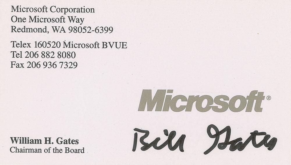 Microsoft business card belonging to Bill Gates, 3.5 x 2, with text identifying him as "Chairman of the Board," signed in black felt tip, "Bill Gates." In very fine condition.