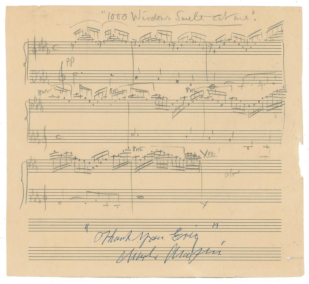 Ballpoint signature and inscription, "Thank you Eric, Charlie Chaplin,” on an off-white 8.75 x 8 sheet of music written in pencil by his musical collaborator, Eric James, entitled "1000 Windows Smile at Me." In very good to fine condition, with light creasing, a tear to the right edge, and old adhesive residue on the reverse. James was associated with Chaplin for more than twenty years, collaborating in the development of compositions and subsequent orchestral arrangements that became celebrated film scores.